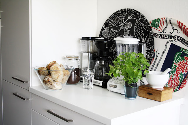 Let your clothes be a part of the room with this clever device. I don't think it's too hard do make by yourself. Or why not write the grocery list or the menu of the week directly on the tiles in the kitchen? There is a lot of pens which are easy to clean off. On the last picture I like that they constrained the messy things on to a small surface, like on top of the wooden box. /Hanna