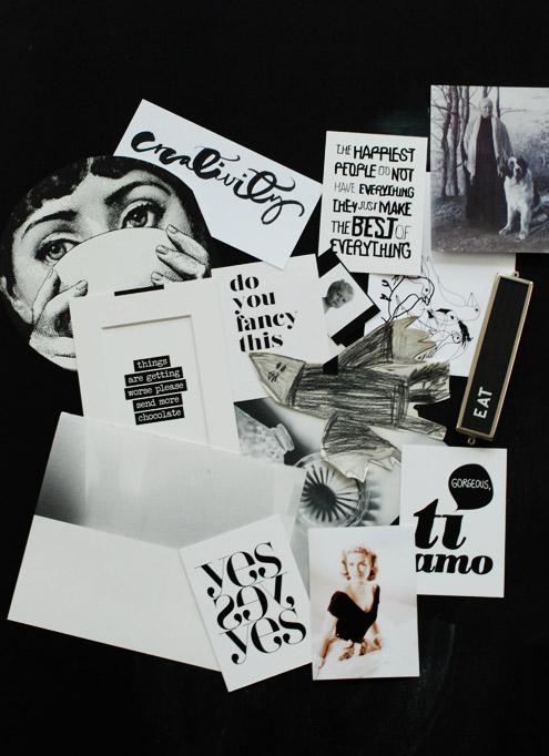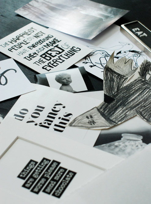 This inspiring composition was found over at En mammas dag-Weronica, where our very own DoYouFancyThis postcard has had a place. I like the black and white color scale mixed up by different types and photos. /Hanna