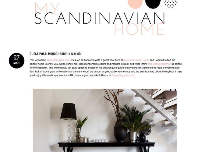 Today I'm the guest blogger over at My Scandinavian Home. I was really happy when Niki asked me to contribute to her blog (Thanks, Niki!) since I've been a regular visitor of the blog for a long time. I hope you will like it, click here for the whole thing. Now I have to get back to packing the ridiculous amount of stuff that you think you will need while travelling. Should I just discard it all and travel light for once? /Hanna